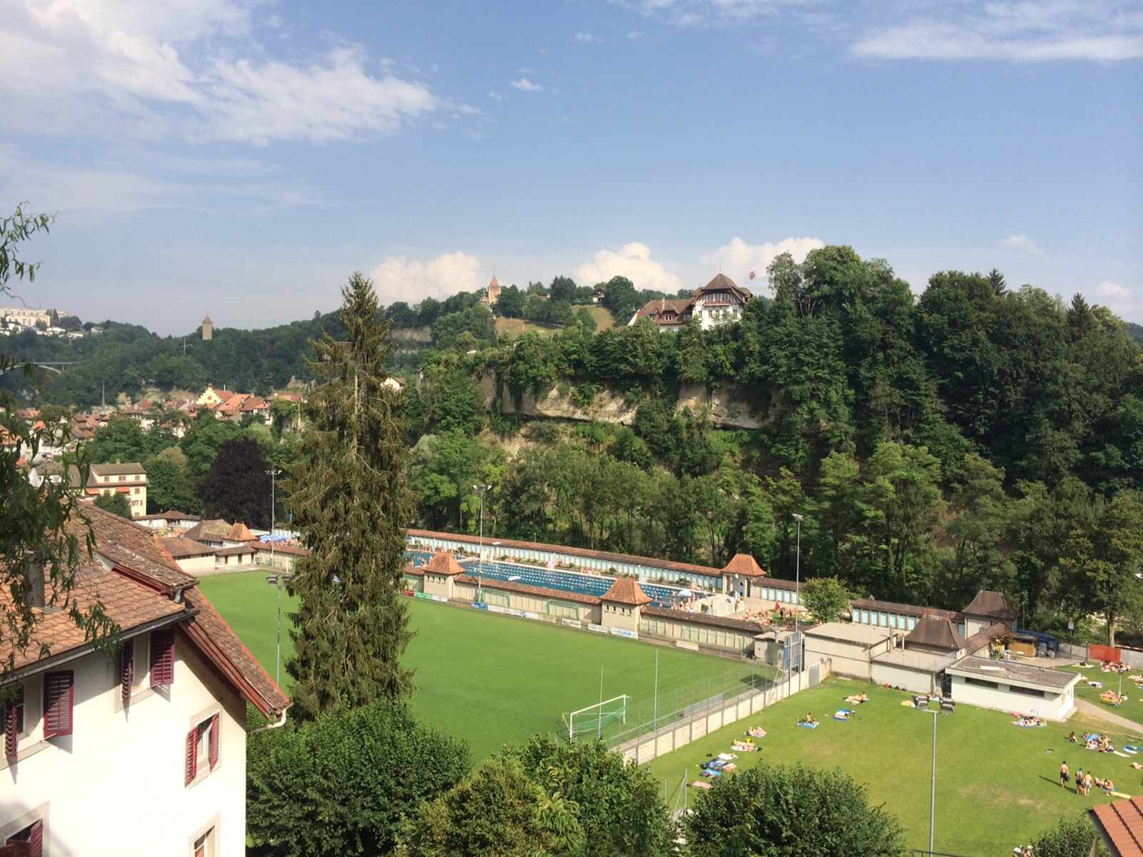Papa Hatch happens to be in Fribourg for a couple days Right Now and has dutifully scouted out the new apartment, kids’ school, and – oh, the burden he bears – the local community pool and eateries. He reports that it is utterly charming and VERY hilly, especially during a heat wave.