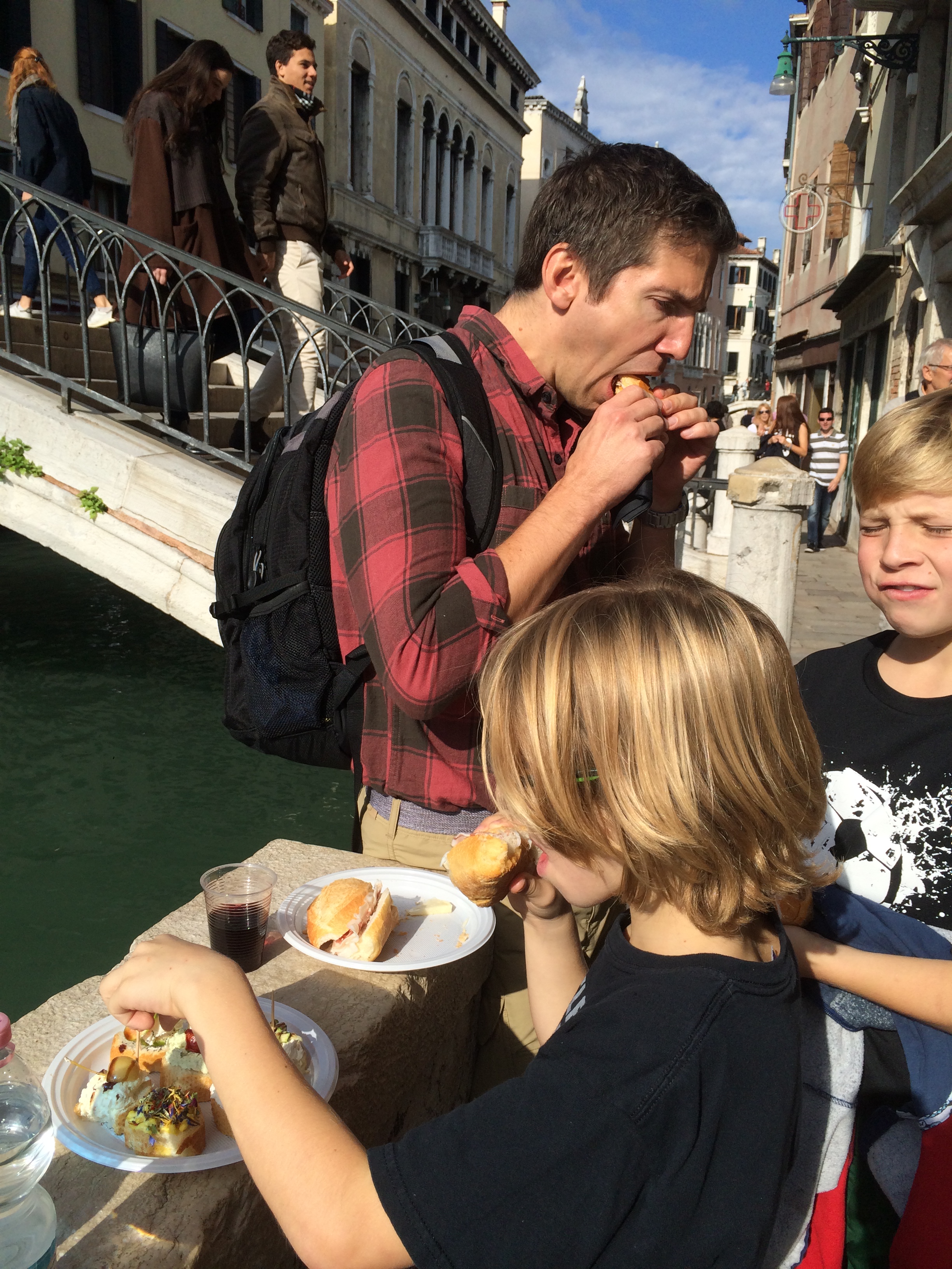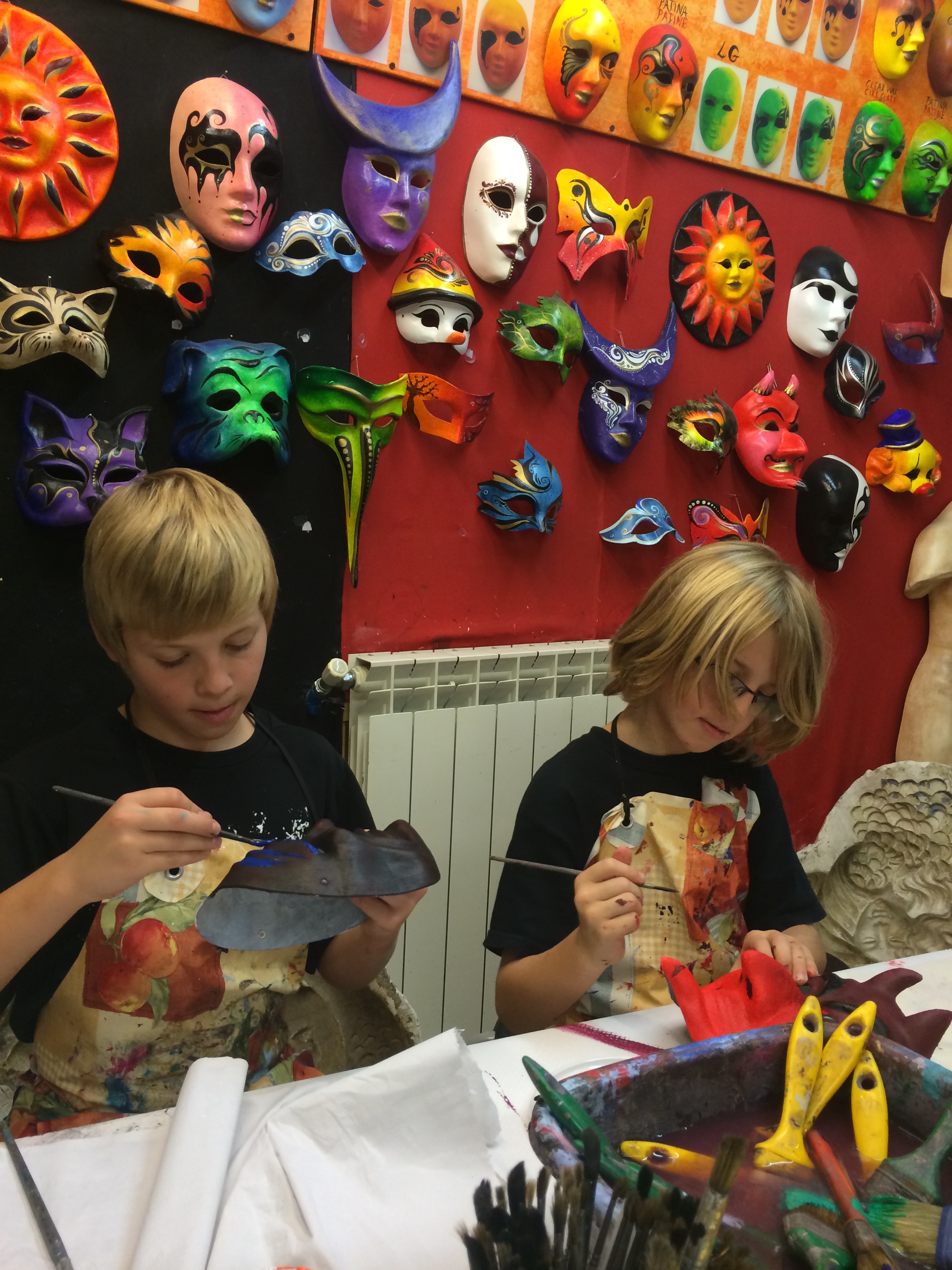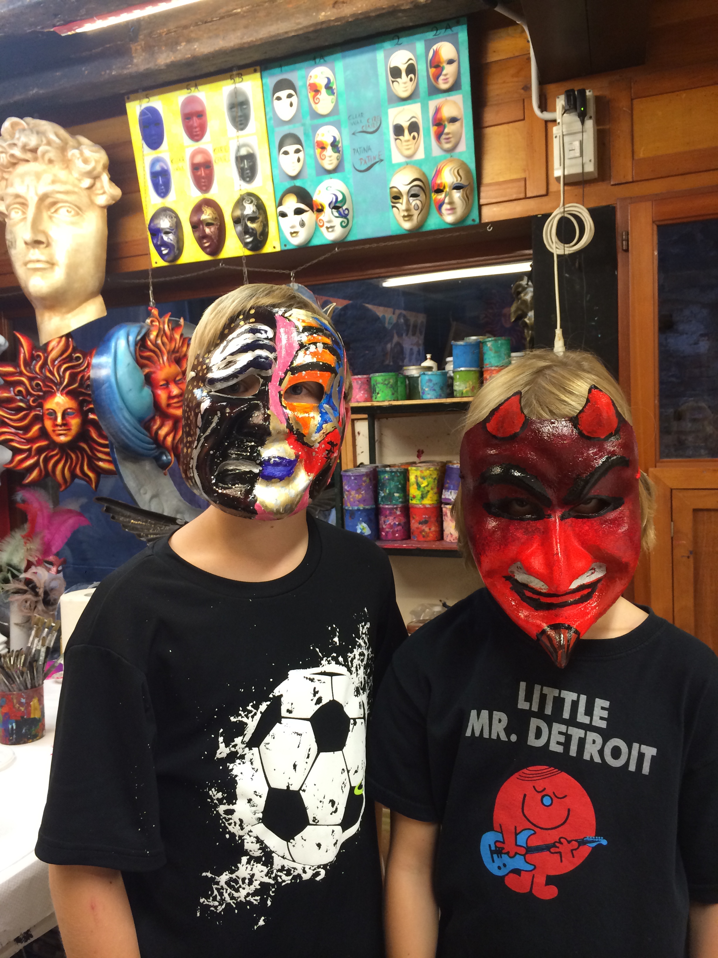 VENICE. What a beautiful place… but what incredible Disneyfication. We managed to enjoy it in spite of overpriced everything, hordes of tourists and (understandably but disappointingly) unfriendly locals. Yes, it was REALLY crowded even in the middle of October. It’s possible to get away from them if you are willing to get lost in the back streets. It sounds silly, but I really wished I had a compass! That would have allowed us to stay off the main drag (which has occasional signs) but still go generally in the right direction. Weekday evenings were better too. The best thing: the kids painted masks at Ca’ Macana – they really loved this. That said, you can’t reserve it until the day-of unless you are part of a tour group, and the staff was not very friendly, but regardless, this was really fun and gave them a neat souvenir. We also bit the bullet and did take a gondola – it was very pleasant, it’s a set price (albeit exorbitant) so we knew what we were getting into, we had a nice gondolier and we would have regretted skipping it. Just a few days before the trip, I decided to go ahead and book us on the so-called “Secret Itineraries” tour of the Doge’s Palace (Palazzo Ducale) – it was only a few dollars more than a regular ticket, allows you to get in without waiting in a long line, gets good reviews and you get to see parts of the palace not allowed with the regular ticket. It was worth it – the guide was good and told some great stories, particularly about Casanova, who was imprisoned there for well, pretty much for what you’d think (involving other people’s wives), but he made a dramatic escape. We all enjoyed the tour, but honestly, it was mostly worth it to skip the line. One of my favorite things was eating lunch the way the Venetians do – getting little snacks (“ciccheti”) and some wine and eating standing up outside. Other than that, even with restaurant recommendations, we managed to eat mediocre food with bad service. I am glad we went to Venice, but I do not think I will make a point to go again. Another tip: if you drive, be sure to reserve a parking spot in advance, especially if you go in the summer.