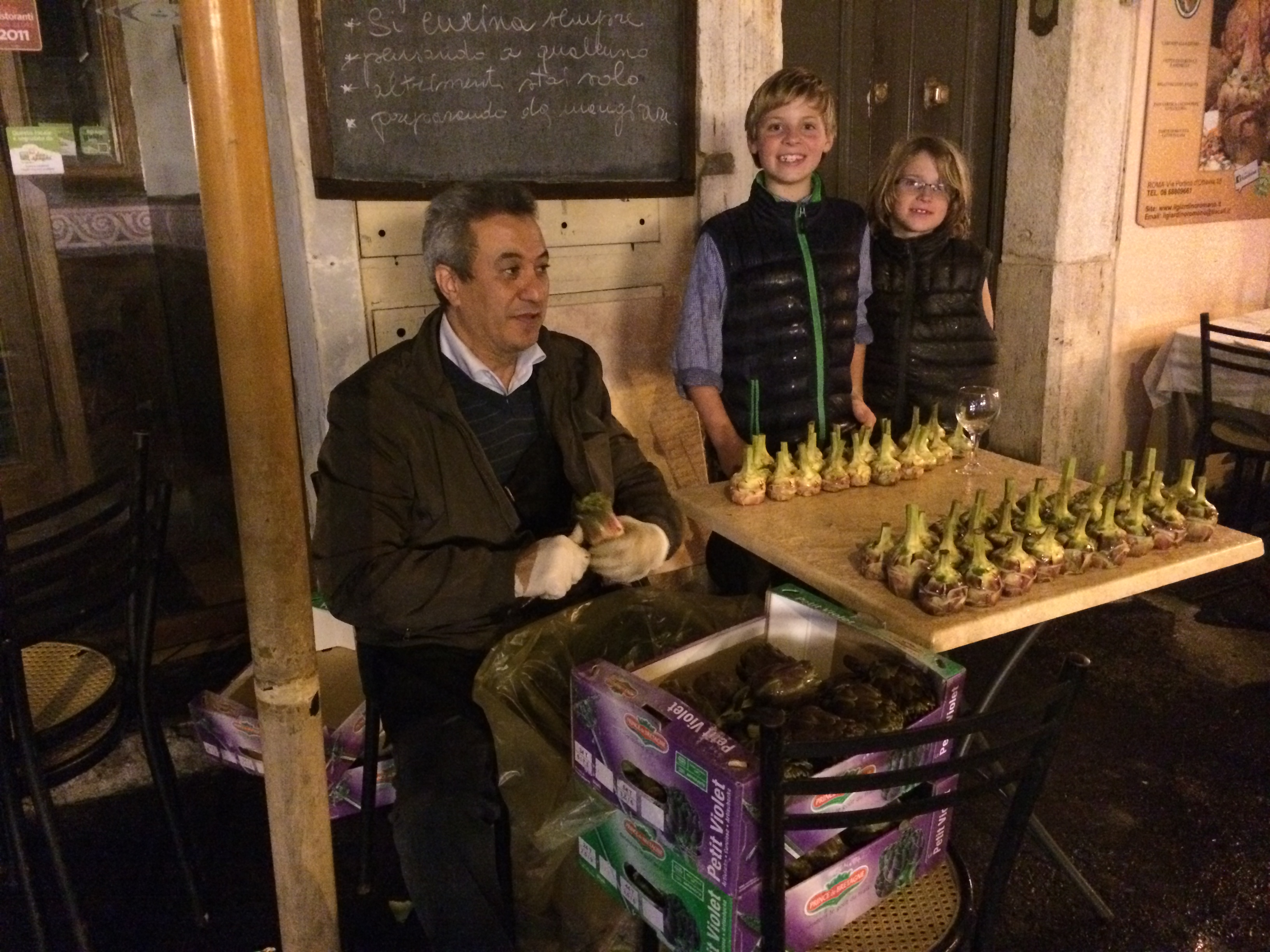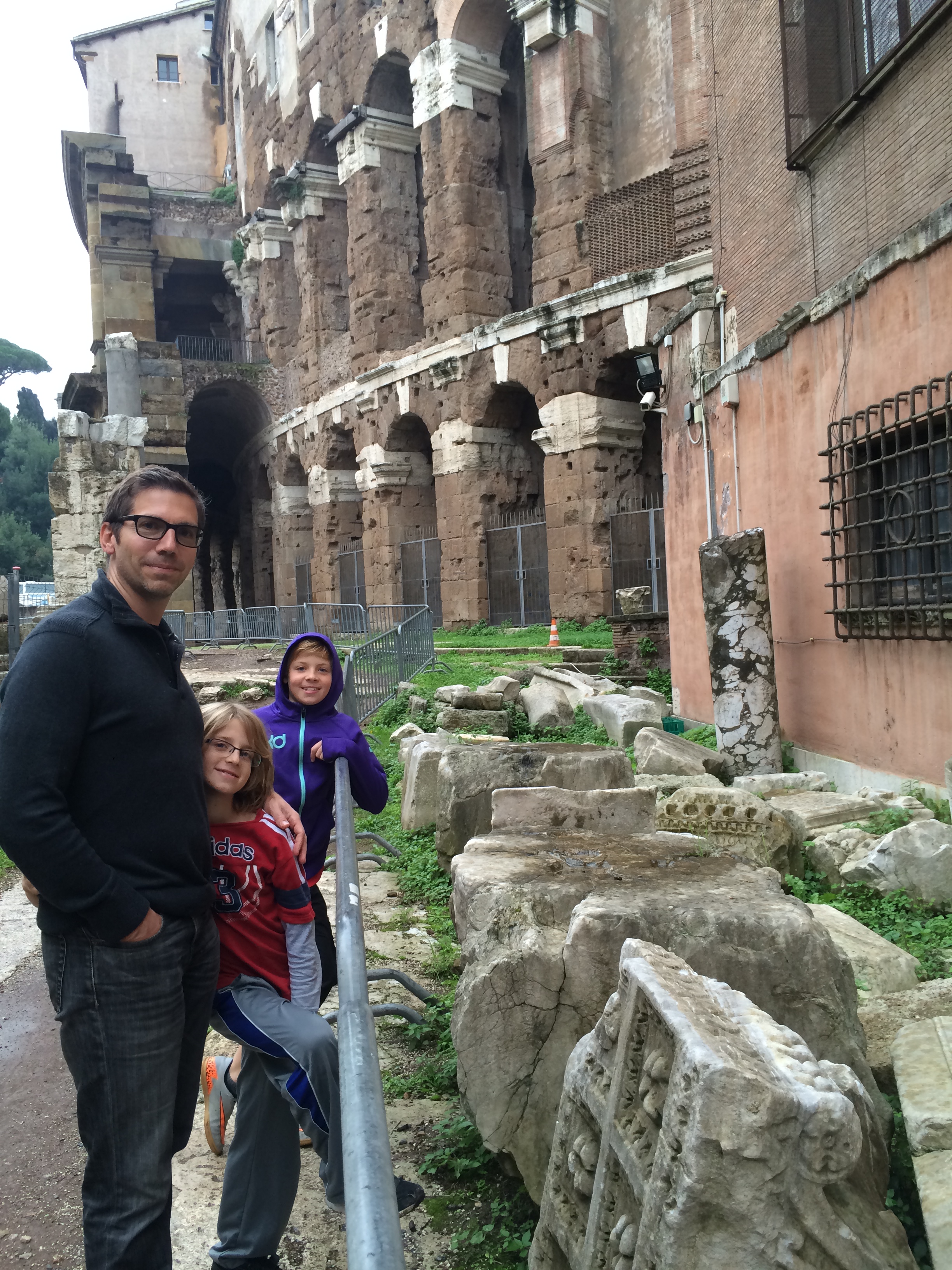 ROME. We stayed in a great neighborhood here, the old Jewish ghetto. Now full of restaurants, it has its own pre-Roman ruins, retains a cool, unique character and is very convenient. It also has a fascinating and, of course, tragic history. Jews actually came to Rome directly from Israel in the second century B.C. – before the Diaspora. The Jewish ghetto was created by the Pope in 1555; Jews were forced to live within its walls (locked in at night!) for three hundred years – only really experiencing full rights in 1870 when Italy became a unified country. When the Nazis came through in October, 1943, they deported 2000 Jews to concentration camps. Only sixteen returned. Seeing memorial plaques set in the sidewalks around the neighborhood and on the school wall, while at the same time hearing present-day schoolchildren laugh and chatter within their school walls was very moving.