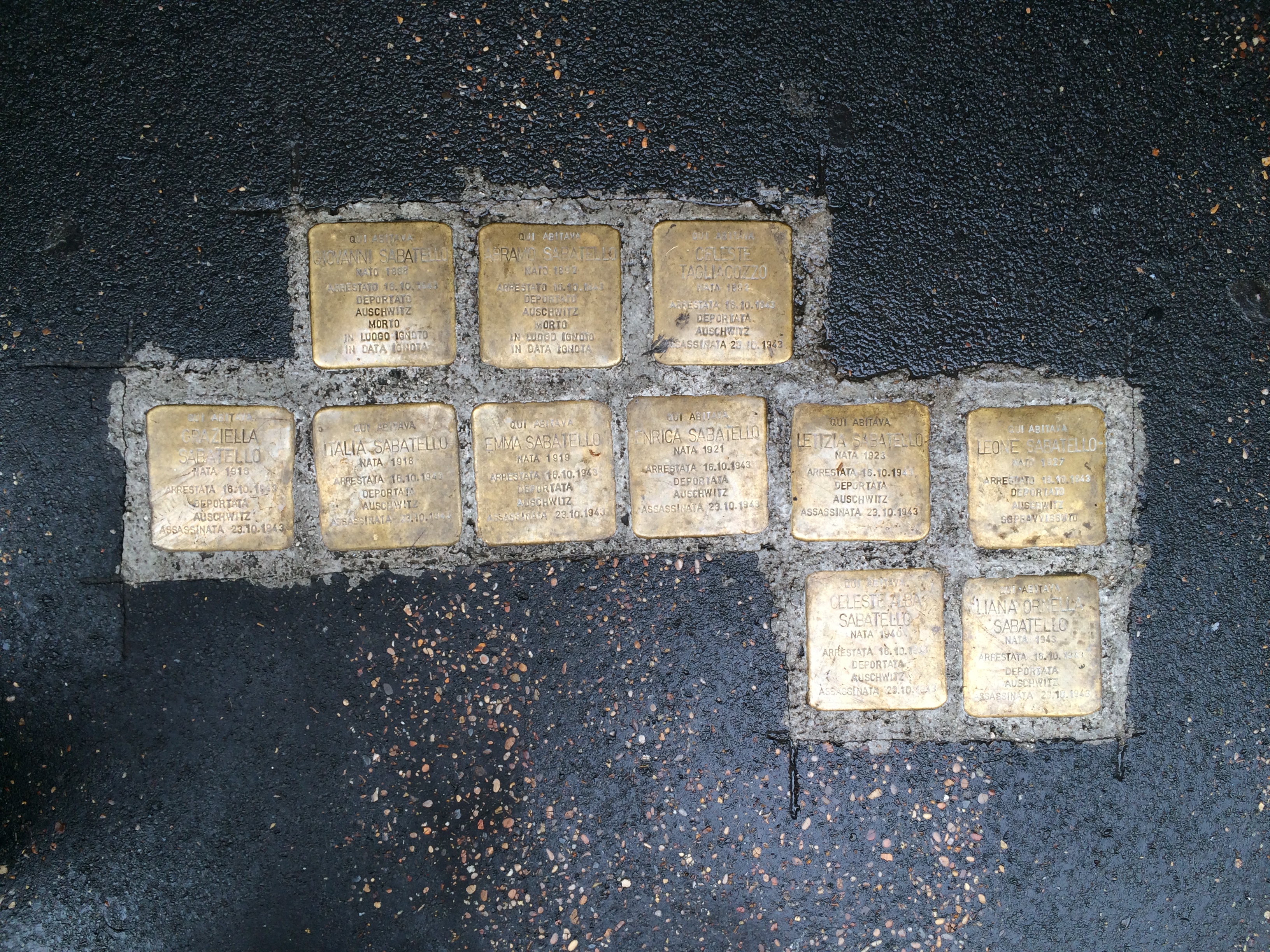 Memorial plaques in the sidewalk honoring those who were deported by Nazis and killed in concentration camps