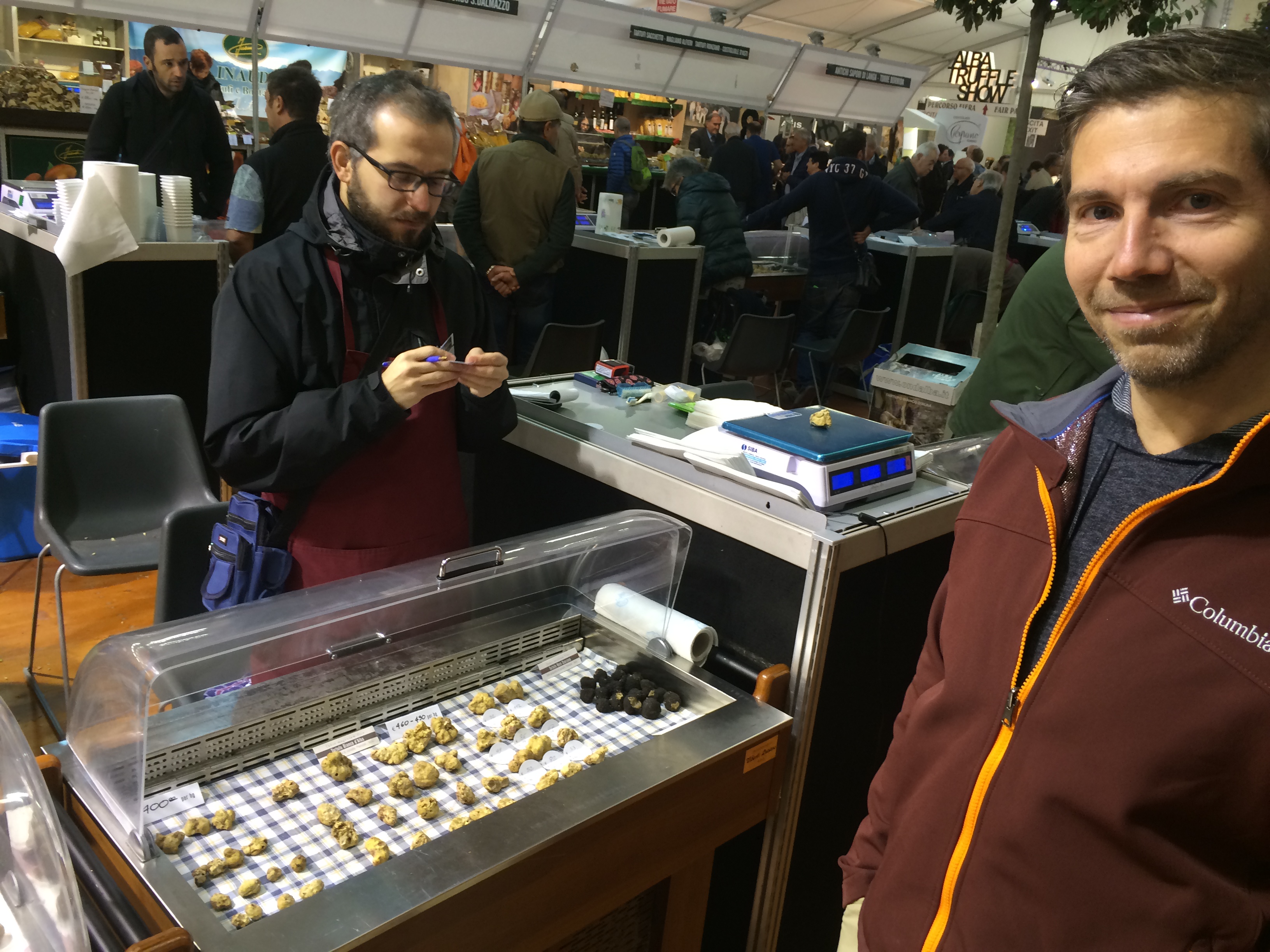 ALBA. From Cinque Terre, we headed north to Alba – host of an annual month-long truffle festival (the fungus not chocolate) and a perfect stopping point for our last night. Friday evening was fantastic in Alba! Almost no foreign tourists, but plenty of people enjoying their passaggiata down the pedestrian-only streets. About ten wineries or shops had tables set up for free tastings to all passersby; we had such a good Barolo (from right down the road – the Azienda Agricola Gillardi) that we bought two bottles on the spot. It didn’t hurt that the scent of truffles pervades the city. We hit the truffle festival the next morning… along with an influx of the all-too-familiar tour groups, although Alba is enough off the beaten path that it was bearable. The festival was something to see! All those high-priced truffles and other local products (olive oils, balsamic vinegars, fresh and dried pastas, pesto, hazelnuts and hazelnut-flavored things). I had been really excited to have eggs with shaved truffle on it – yum! – until I saw the price: €4 for the egg, €40 to add the shaved truffle. You know what? I’m good just smelling it for free.