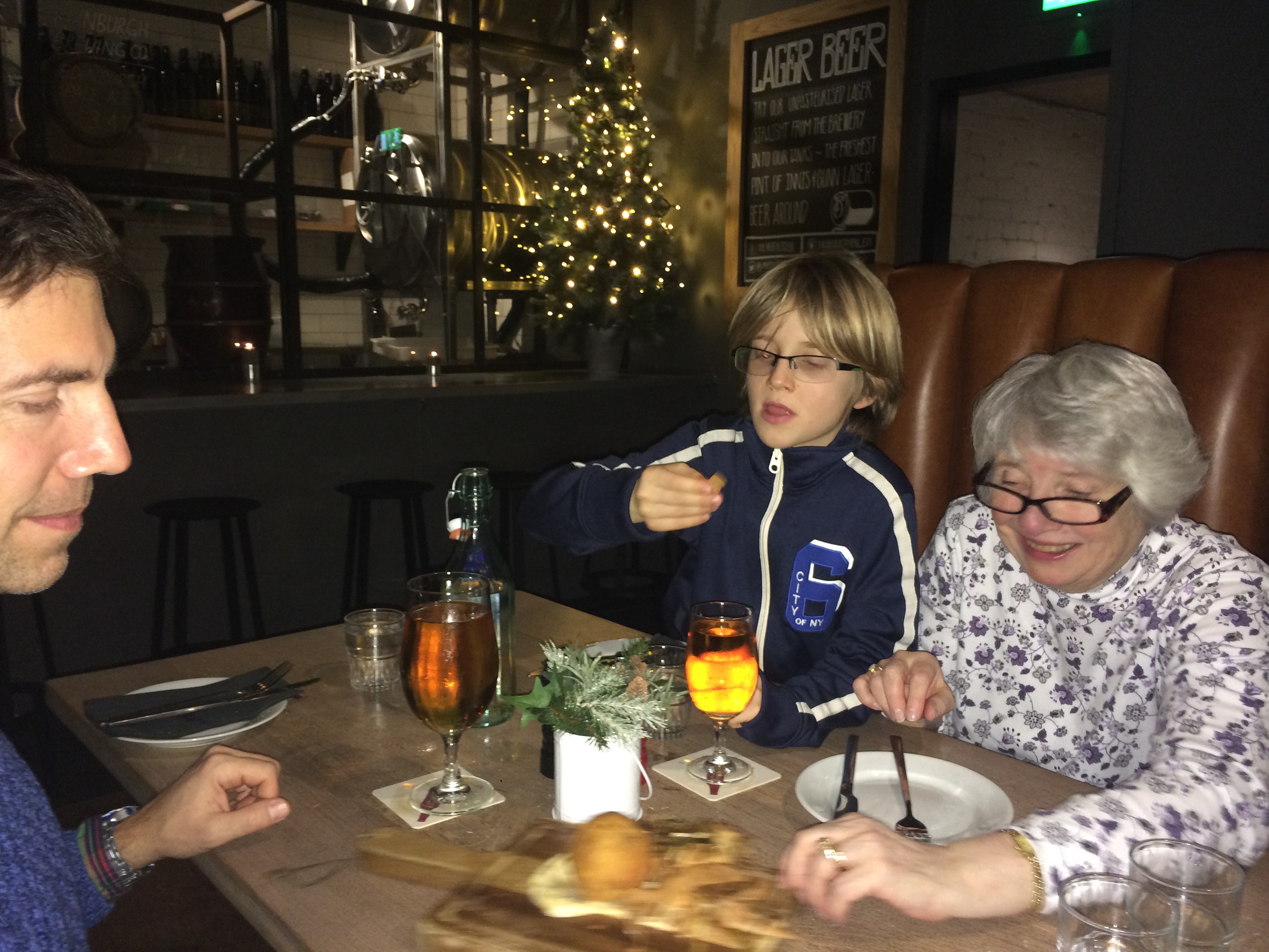 After settling in, we met up with my mother-in-law, who had flown over earlier in the day from the U.S. and stayed in a hotel around the corner. Such fun to see family! We were soon enjoying a Scottish dinner that included haggis(!) – actually a “haggis donut” – which was surprisingly GOOD (I never thought I’d say that). PapaHatch did manage to set his menu on fire, which luckily neither burned down the restaurant nor seemed to faze anyone around us (“it happens all the time,” said our cute waitress).