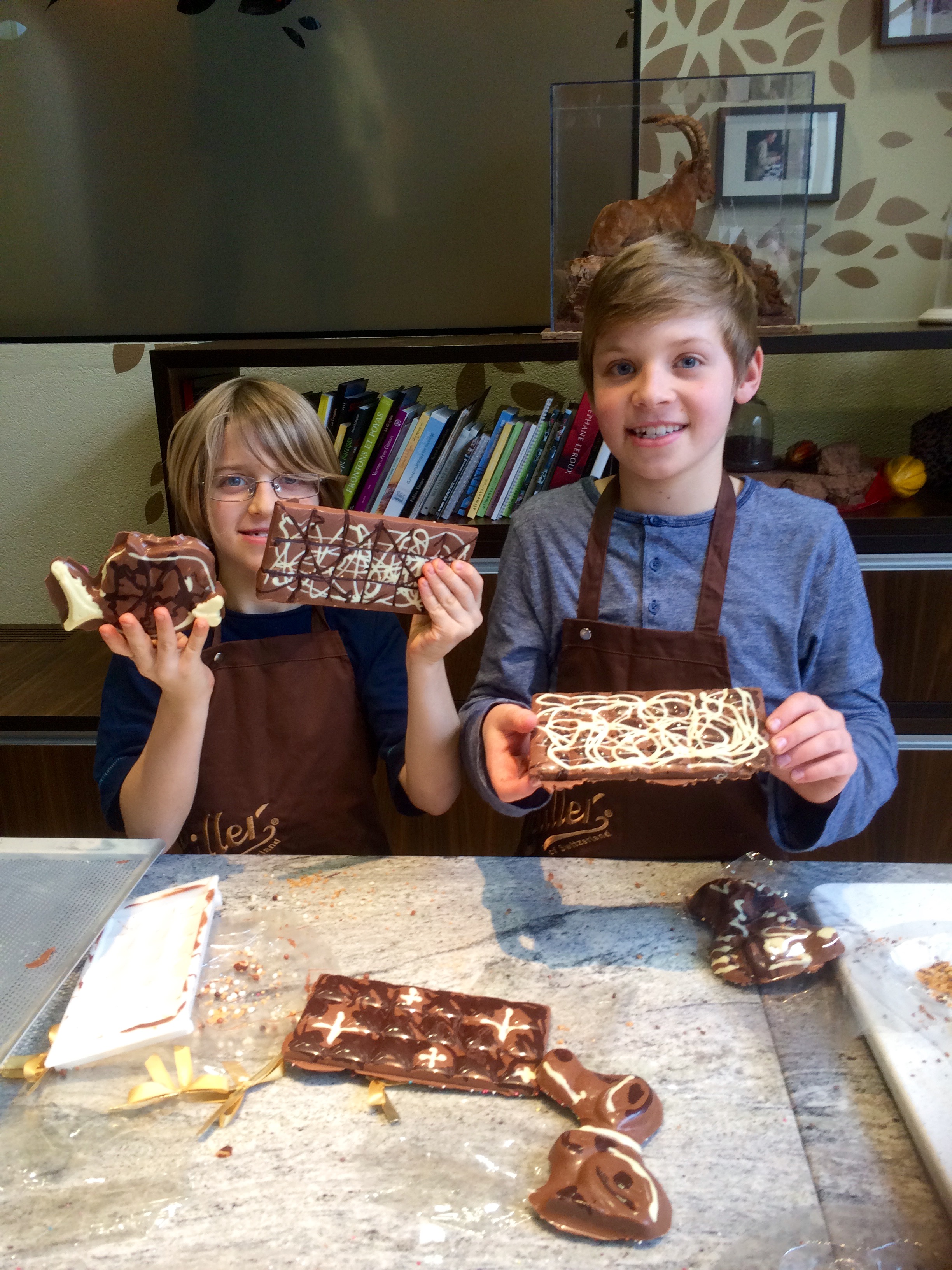 In reviewing the first half (la première moitié) of our adventure here, I’ve been thinking about my favorite Swiss experiences – ones that I will treasure forever. Eating fondue in a barn with the cows whose milk had yielded the cheese was a privilege. Floating down the Aare River in Bern must be one of the most fun and thrilling things to do for free. Seeing the cows dressed up in their finery for the Désalpe with my mother and her friends was an incredible sight, especially in front of the exquisite backdrop of Staubbach Falls and mountains in Lauterbrunnen. Our weekend in Zermatt was not only visually stunning but also a beautiful gift in terms of spending time with new Swiss friends – the perfect ski day, against which all future ski days will be measured. I loved creating unique chocolate bars with my sons at the Cailler chocolate factory.