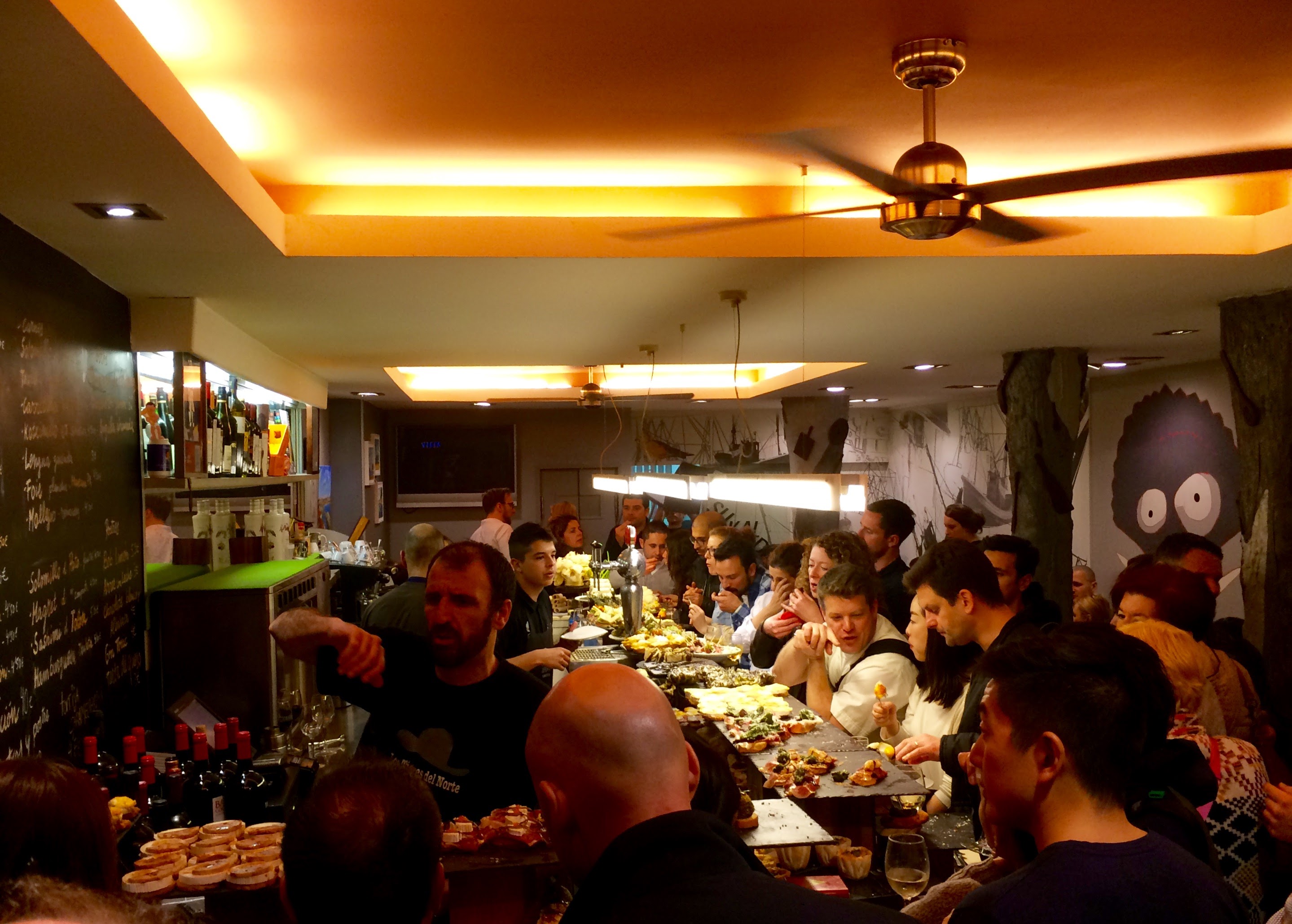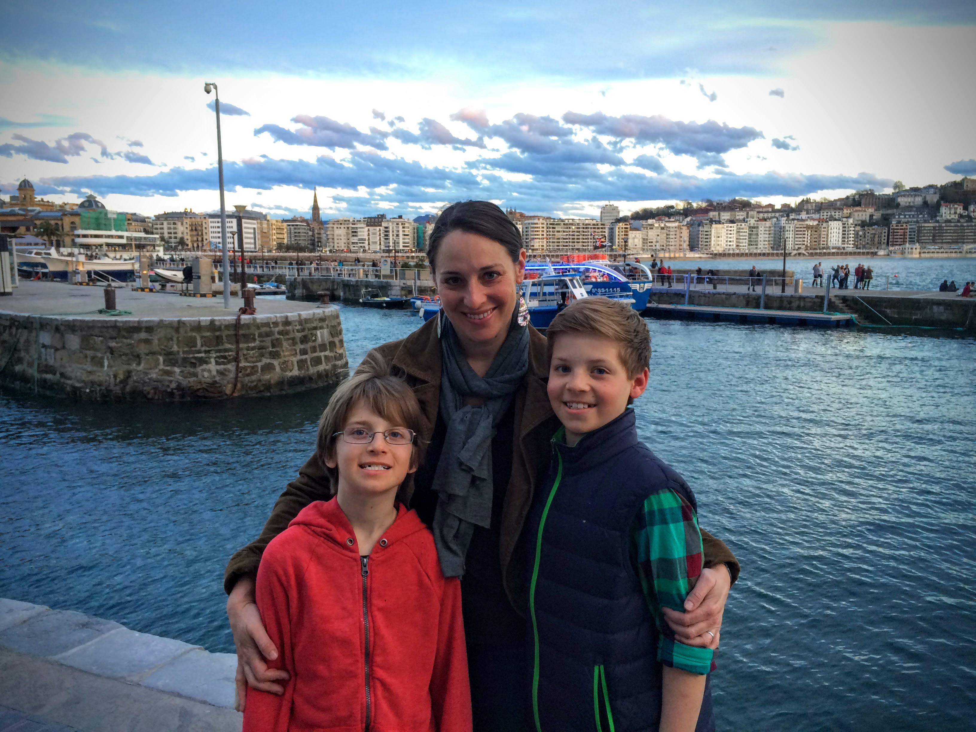 Pintx me! We continued our pretty drive into Spanish Basque Country for our two-night stay in the charming city of San Sebastián (called Donostia in Basque). It being Easter weekend and beautiful weather, it was packed! As PapaHatch pointed out, though, it was mostly Spanish tourists, and I will say the atmosphere was fun, lively and friendly. We tried our hand at a pintxo bar crawl (pronounced “peench-ohs,” pintxo is the Basque word for tapas); our itinerary: Bar Zeruko, Taberna Gandarías, and La Viña (La Cuchara de San Telmo was regrettably eliminated due to the long line). The idea is that exotic pintxos are displayed, and you “just point!” at what you want. Traditionally, you are charged at the end based on the number of toothpicks on your plate – how charming! I was assured on TripAdvisor repeatedly that as long as we went “early” (before 9pm!), the bars would be “empty.” Well, it turns out that a pintxo crawl is more challenging than fun with kids at least on a crowded holiday weekend. In our reality, the bars were crowded starting at 4 or 5pm without let-up, so by 8pm, our asking the harried bartender for explanations was not ideal. With no explanatory signs or menus (or if there were, they were in indecipherable Basque), most of the mouth-wateringly beautiful pintxos remained a mystery – we ended up playing it safe (=boring) with most of them, especially after I realized that the yummy looking noodle one was actually elvers (a.k.a. glass eels – hmmm, why is there a black speck on each noodle… um, those are EYES!). At this point, I should admit that I am a big baby about fishy seafood. Fortunately, my sons are FAR more adventurous eaters (except when it comes to vegetables, sigh). In the end, I’m glad we tried the pintxo crawl, but I now understand why people shell out the big bucks for a guided pintxo tour (which I totally scoffed at before).