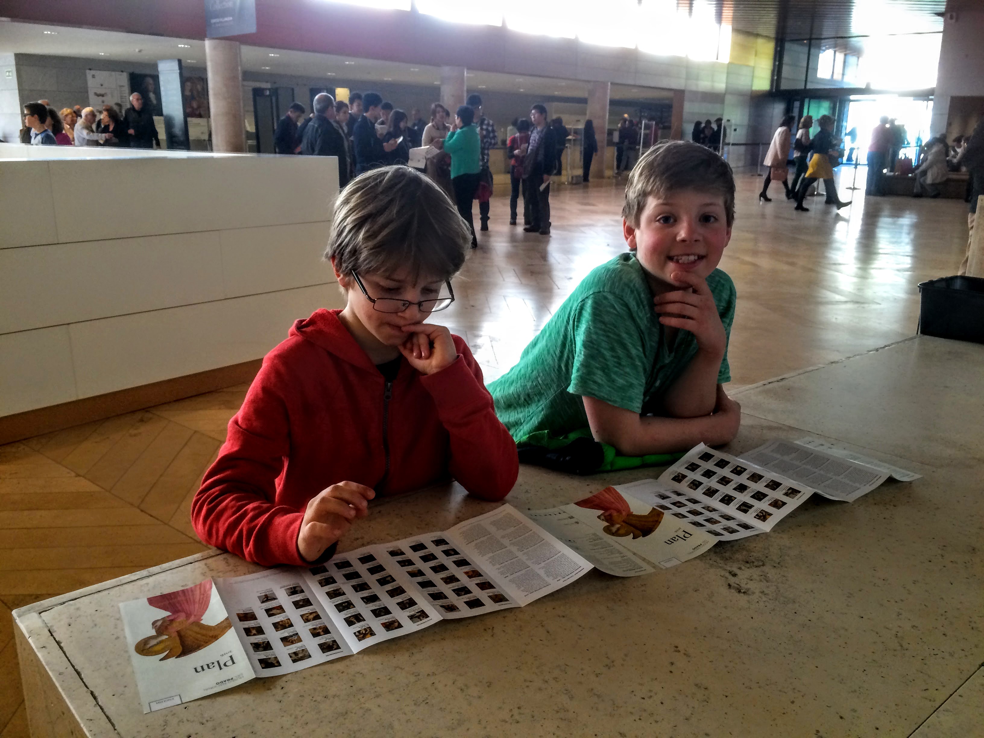 [Digression on maximizing the travel experience: I want to talk just for a minute on how our kids have evolved to actually enjoy art museums. Even when they were little, we have taken them to local museums – we now (aside from this year) live only twenty minutes from one of America’s finest art museums, the Detroit Institute of Arts. The DIA does a particularly fantastic job appealing to kids, so my boys always enjoy going there. A chronically over-checker-outer of library books, I’ve always gotten books for them on various artists (there are some great ones these days!). They were also fortunate to have a really fantastic elementary school art teacher, Mr. Fink, who inspires all his students, so they also enjoy creating their own art (like most kids). One more thing… and this is a little embarrassing… when I was a kid, my family played a board game that (as an adult) I inherited called Masterpiece. It’s a fun game about art auctions; our version featured paintings from the Chicago Art Institute. When it dawned on me how much amazing art we’d be seeing in Europe, I created a homemade travel version with several “new” decks featuring works of art I knew we’d be seeing. I spent WAY too much time doing this, but it was fun. They have a couple other art-related games as well (thanks, Grammy!). The point being that our kids are familiar with a lot of art and even have their favorites. HOWEVER, it is never too late to encourage art appreciation. Easy to do: sit with your kids in front of the computer, go to the website of the destination art museum, and have them check out some of the featured works of art (many even have kid-focused web pages). Hint: Pointing and saying “ha ha!” at the nude figures goes over very well with the tween set.]