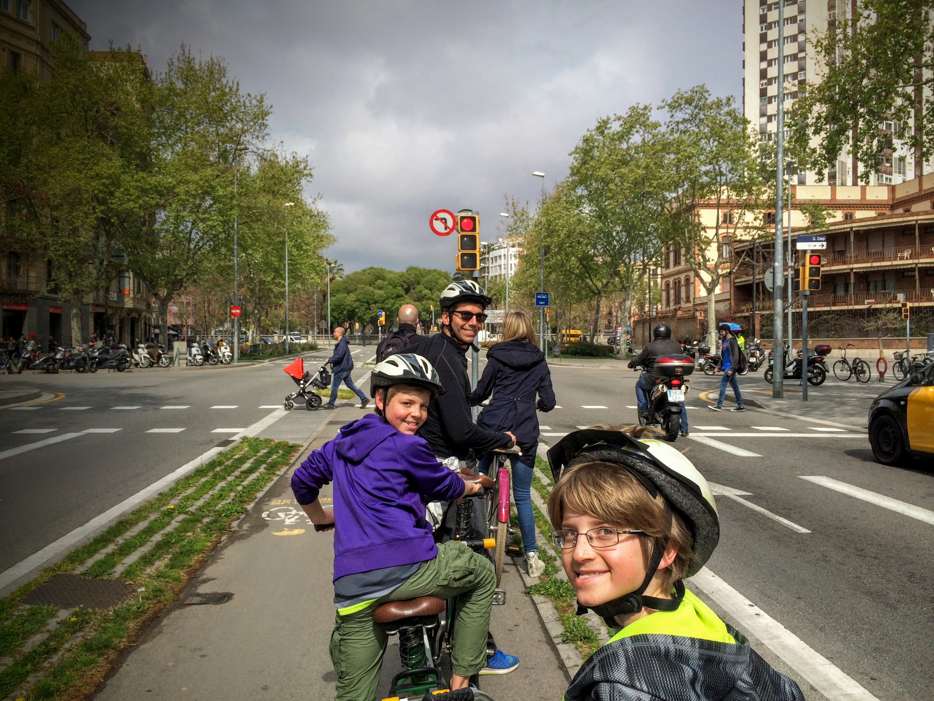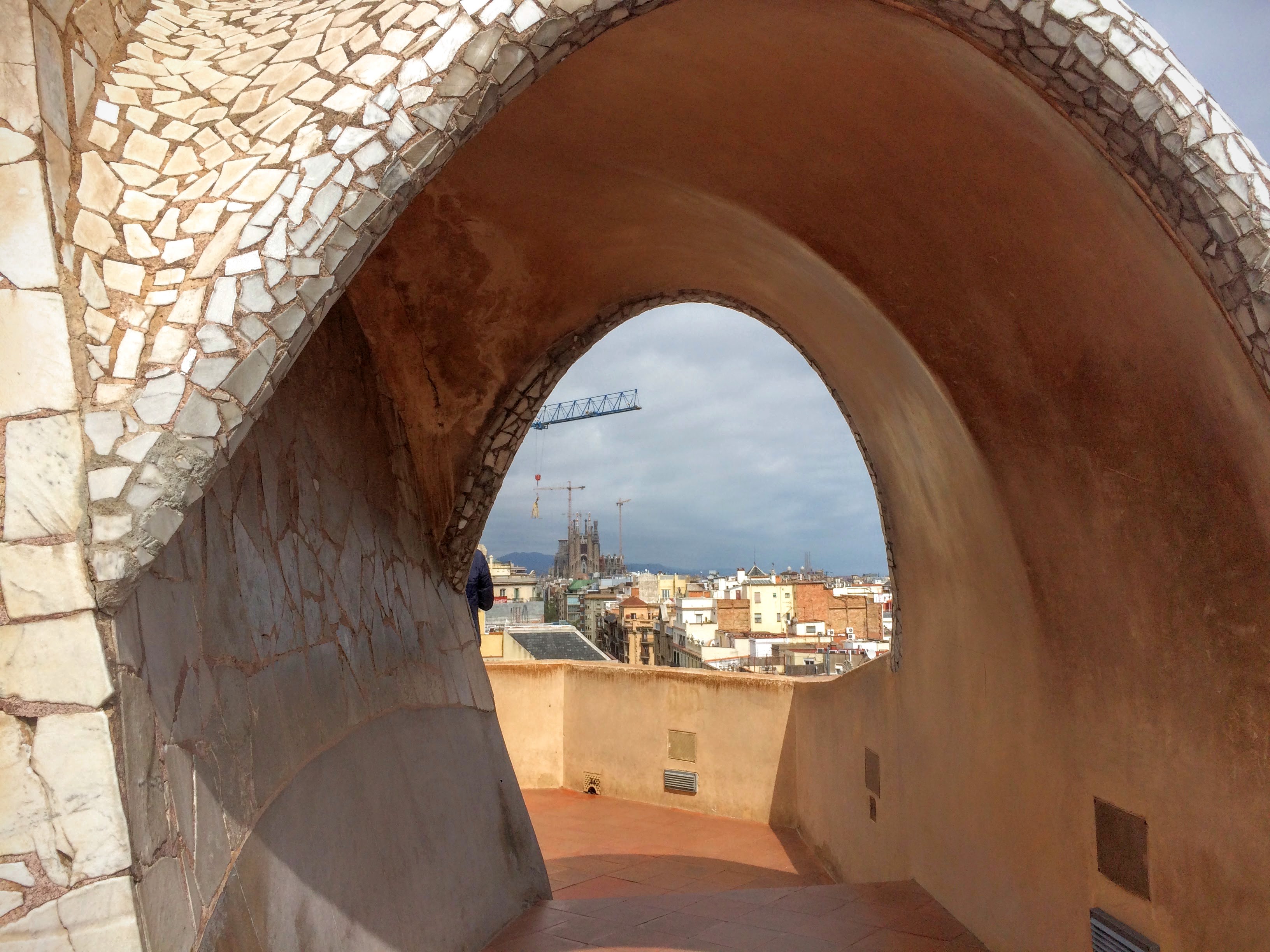 We rented bikes from Green Bikes, and with Barcelona’s cool bike lanes going down the center of some of their biggest avenues, it was actually pretty easy and very fun. We headed to the famed Park Güell, but unfortunately, they weren’t letting anyone without tickets in. Annoying, but I hadn’t want to spend $25 on tickets ahead of time due to the unpredictable weather (it did, in fact, rain all day the next day). Though I would have liked to get the iconic photo of us sitting on the Gaudí mosaic benches with the cityscape behind us, there really isn’t a huge advantage to getting inside the literal “paywall” rather than wandering around just outside of it. It also featured plenty of the aforementioned tacky key chain vendors – bummer. So after a little walkabout, we hopped back on our bike and made our way to the Gaudí masterpiece, Casa Milá, also known as La Pedrera. Hint: skip the line by buying tickets online while you’re standing right there. This was a fantastic visit and well worth going inside. The real star is the roof – topsy-turvy, otherworldly and fun, this is the stuff that make kids fall in love with architecture (look for the chimney “helmets” that influenced George Lucas and his Storm Troopers). The exhibition in the attic was also super-cool, showing how Gaudí designed his amazing arches and got many ideas from animals and their skeletons (the attic itself looks like you’re inside an animal). The next day (in the rain, but it really wasn’t that bad), we took a free Gaudí-themed walking tour with Runner Bean. It was great! Well worth the zero money! (Kidding! We tipped well… but a bargain nonetheless). The kids were engaged and interested and asked excellent questions. I was very proud of them! For more on Gaudí, I came across this great blog post about him.